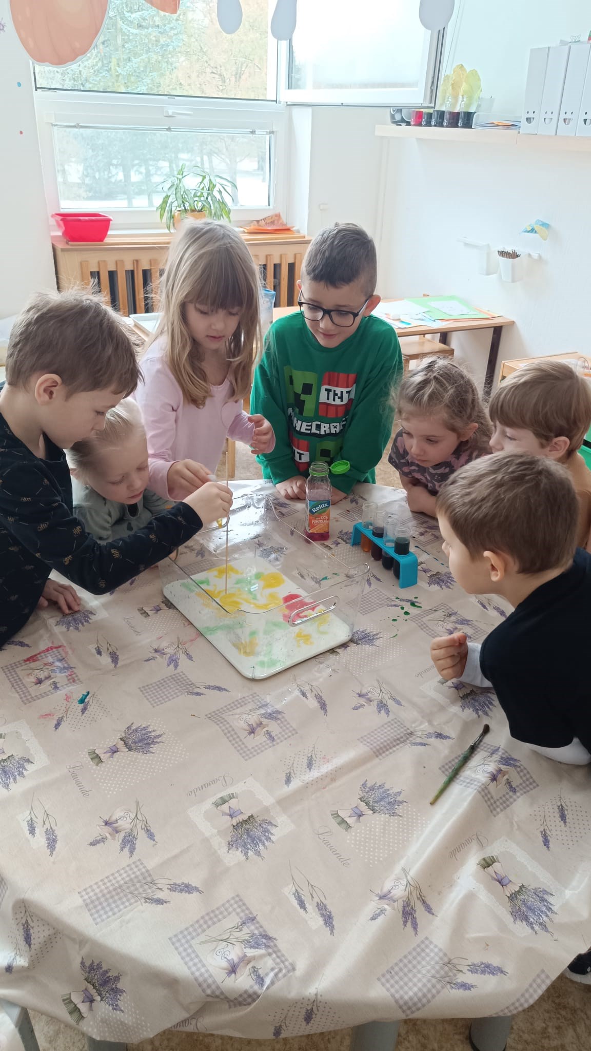 Tento den se zaměříme na zábavnou vědu. Vyzkoušíme si například získat duhu za pomoci lentilek, vyrobit si lávovou lampu nebo obarvit lístky čínského zelí. Těšíme se 😊